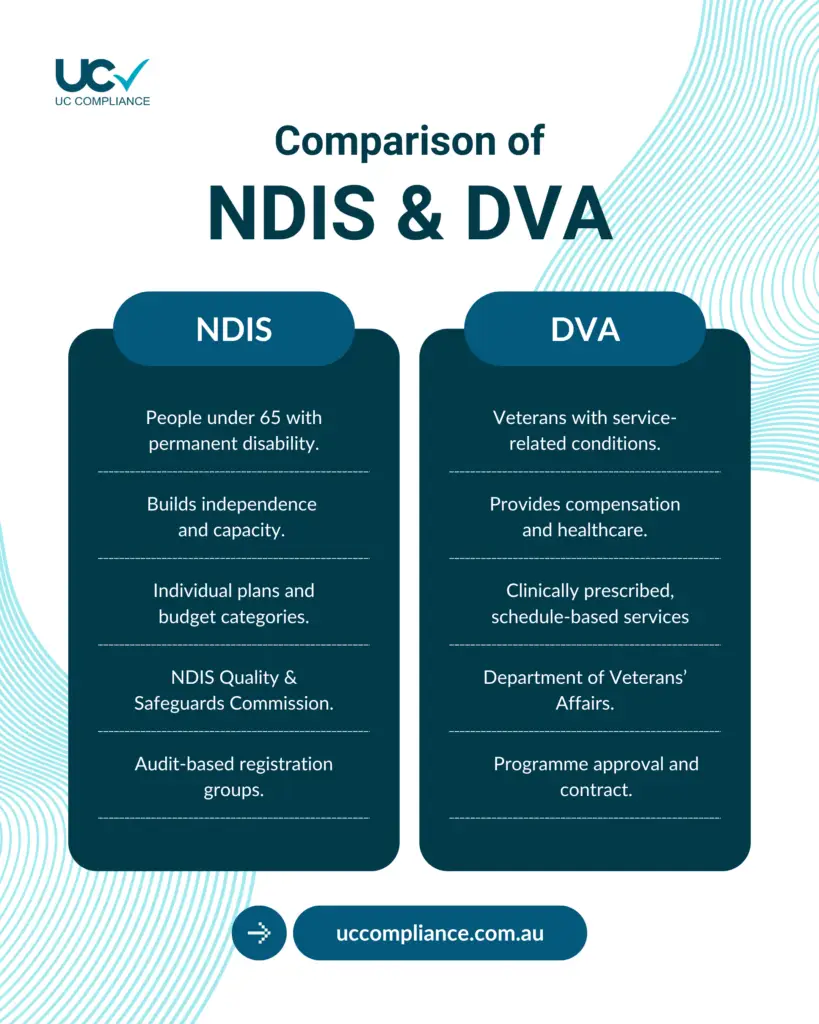In contrast, DVA operates under a programme approval model, typically based on contractual arrangements. It is governed by DVA Guidelines rather than the NDIS Commission. Oversight focuses on clinical documentation standards and periodic review processes rather than audit-based registration.
